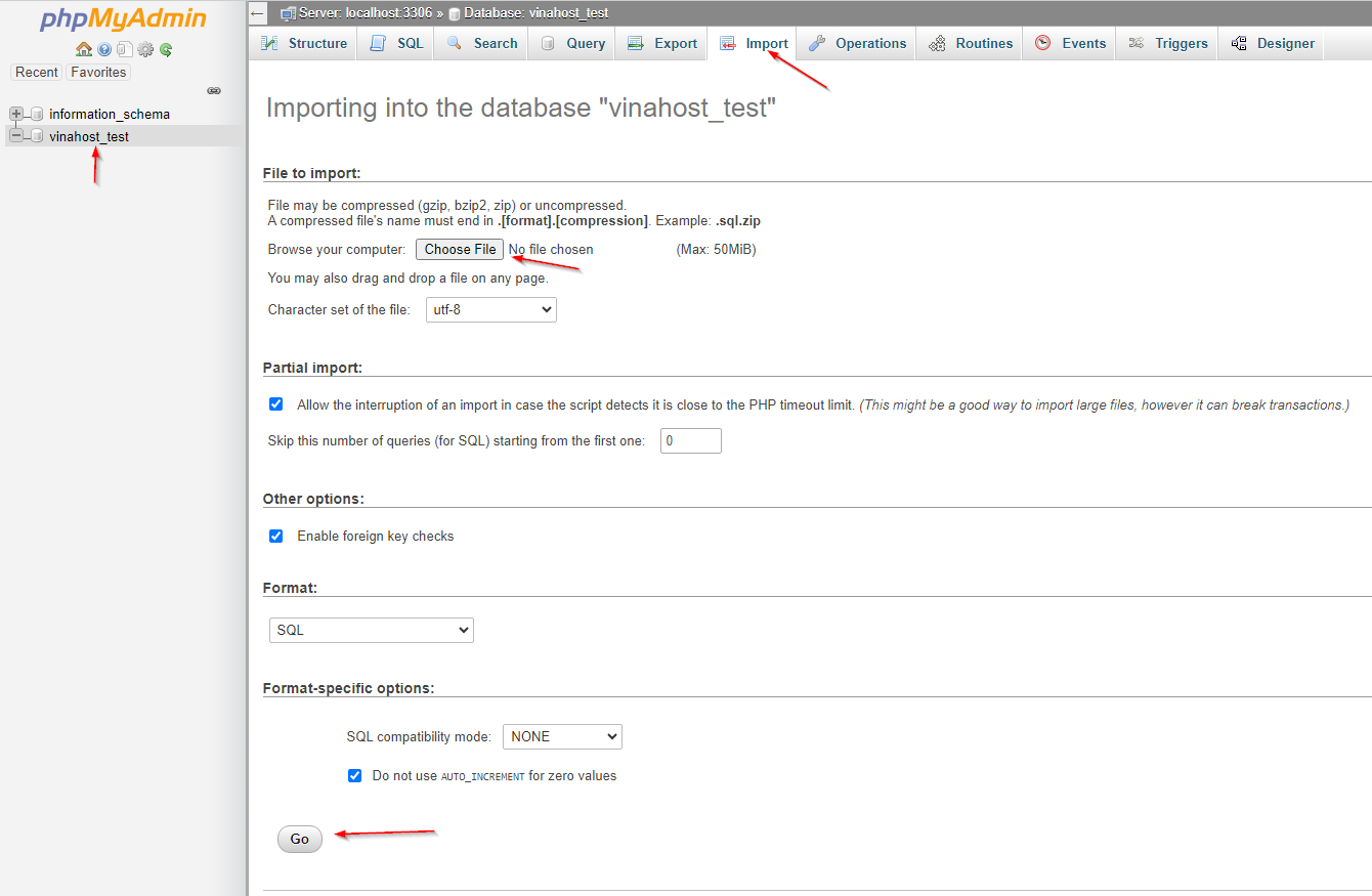 Chọn database cần import dữ liệu, chuyển đến tab Import, chọn file dữ liệu từ máy tính của bạn (thông thường là file dạng .sql) và click Go