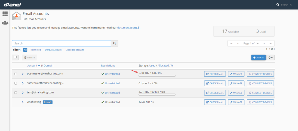 Như ở hình trên thì tài khoản postmaster@vinahosting.com có dung lượng tối đa được sử dụng là 1 GB, hiện tại đã dùng hết 5.58 KB.