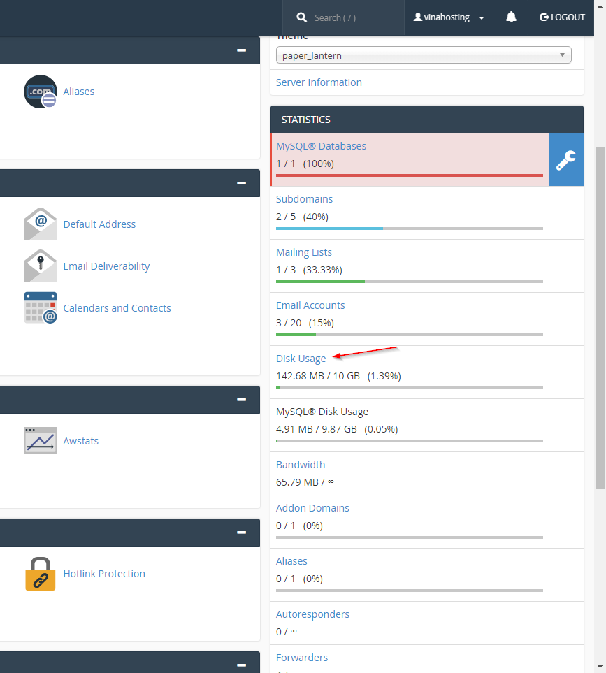 Ta sẽ thấy thông số Disk Usage hiển thị ở khung này, đây chính là tổng dung lượng đã sử dụng trên hosting.