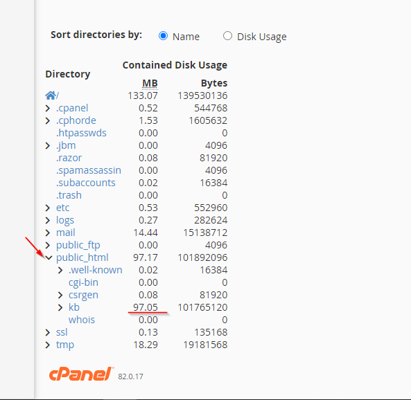 Tuy nhiên, phần này chỉ thống kê dung lượng sử dụng của các thư mục mặc định của hosting. Để kiểm tra chi tiết hơn trong thư mục public_html có thư mục nào chiếm nhiều dung lượng nhất thì ta kéo xuống phần dưới cùng, sẽ thấy thống kê chi tiết: