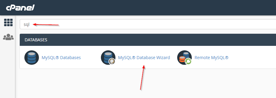Truy cập trang quản lý hosting cPanel, tìm với từ khóa “sql” và vào mục MySQL® Database Wizard