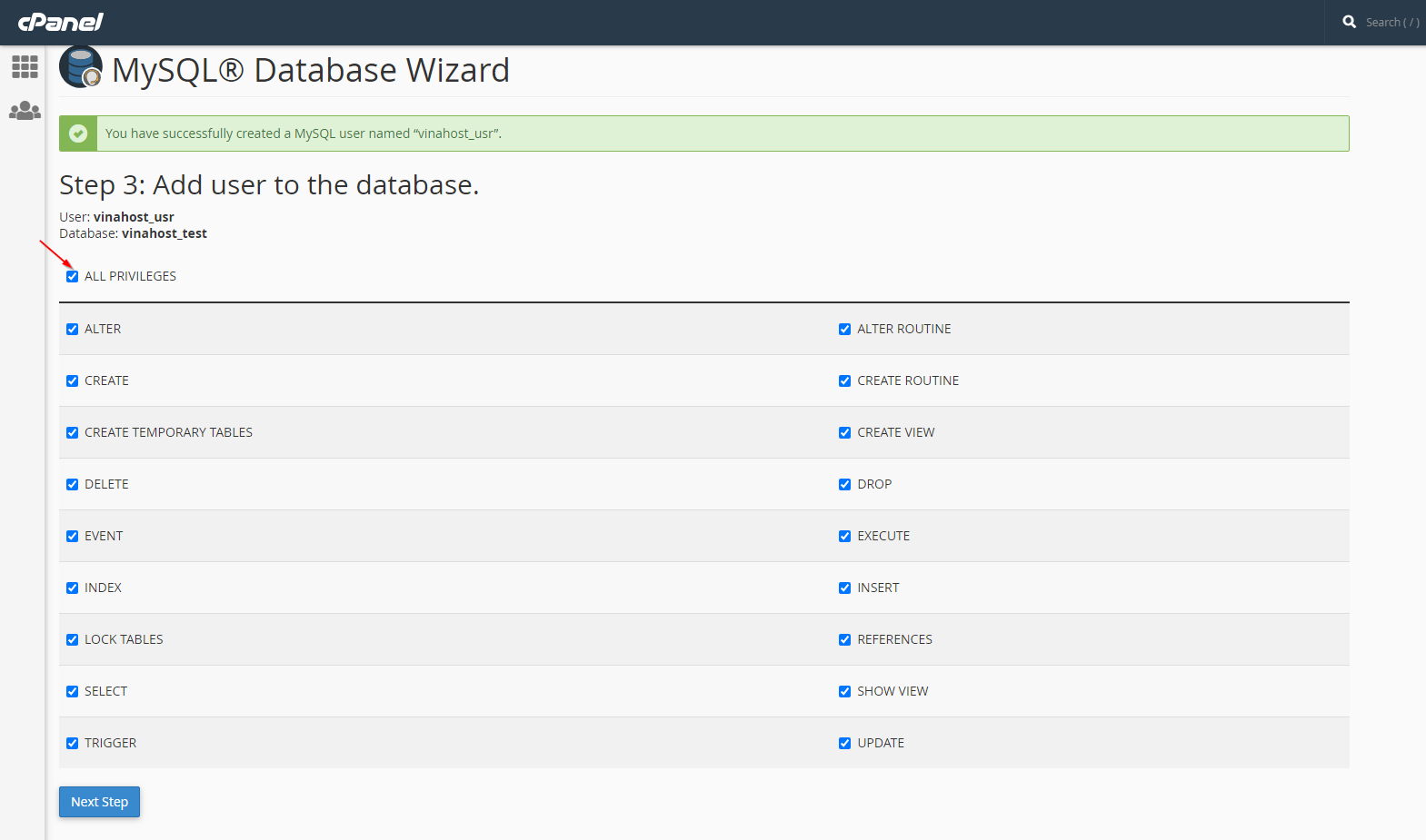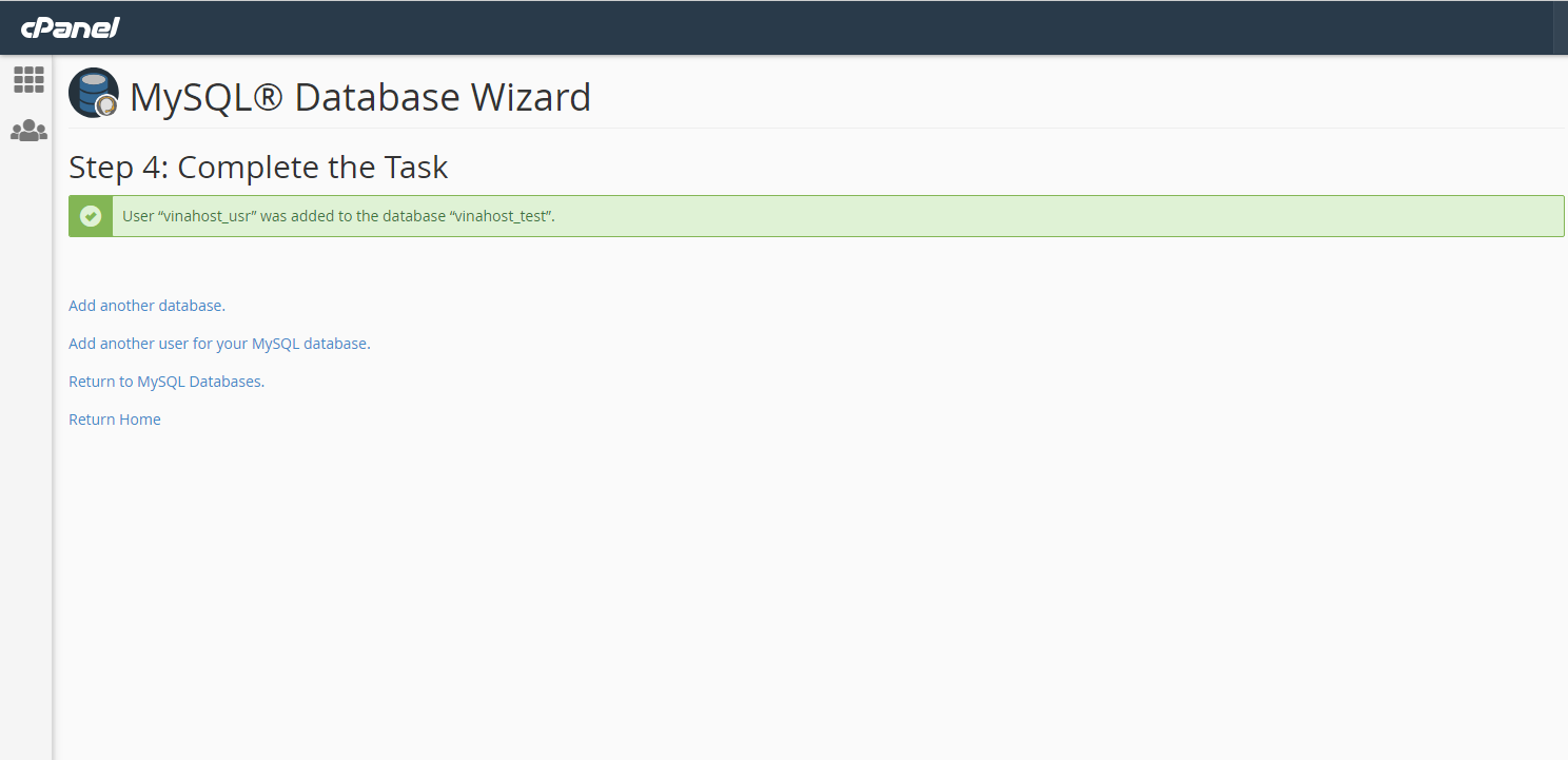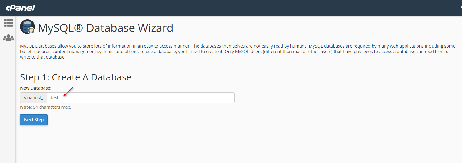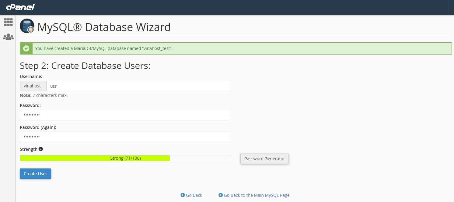 ** Lưu ý: với cPanel, tất cả database name và database username đều bắt đầu bằng các chữ cái đầu của username của tài khoản hosting, và không thể thay đổi được.