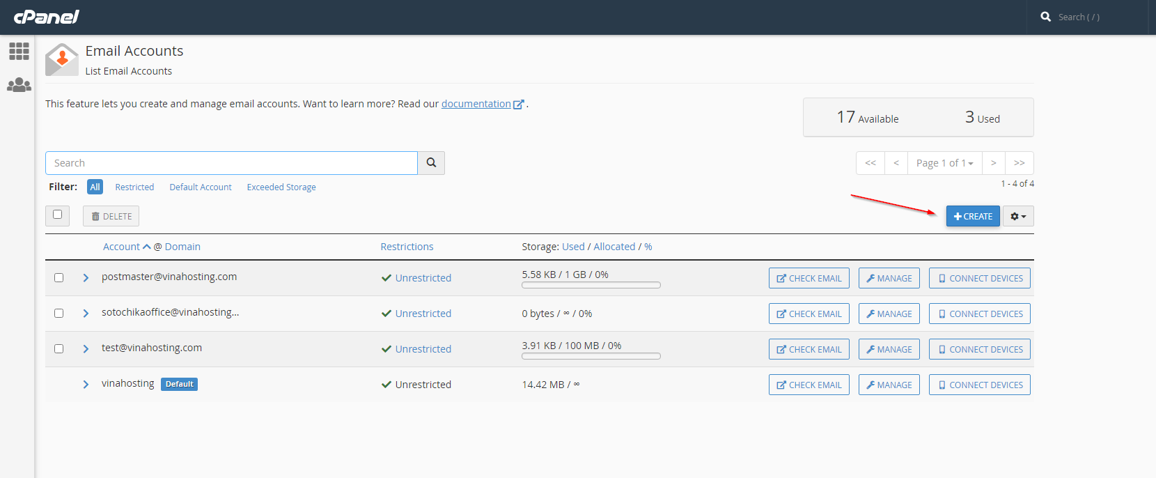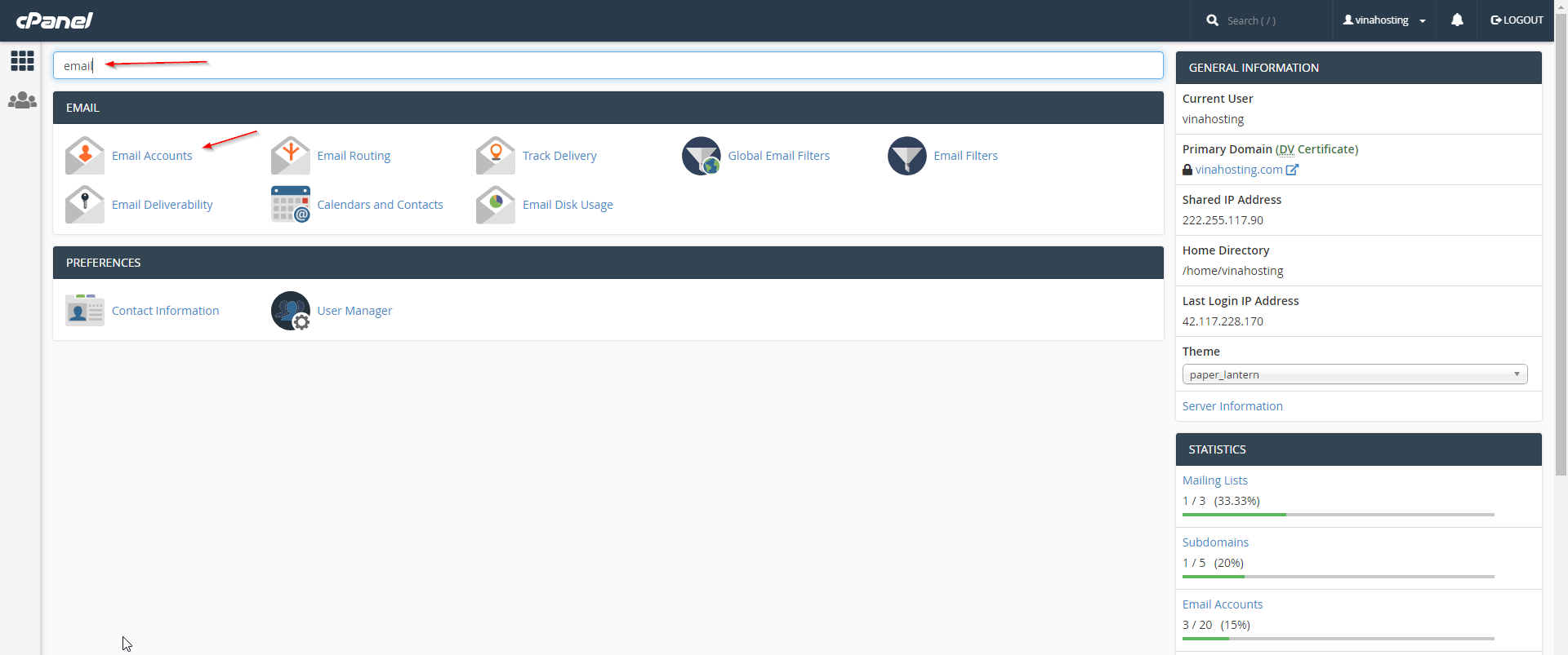 Để thực hiện các thao tác này, ta cũng truy cập vào trang quản trị hosting cPanel, vào mục Email Accounts