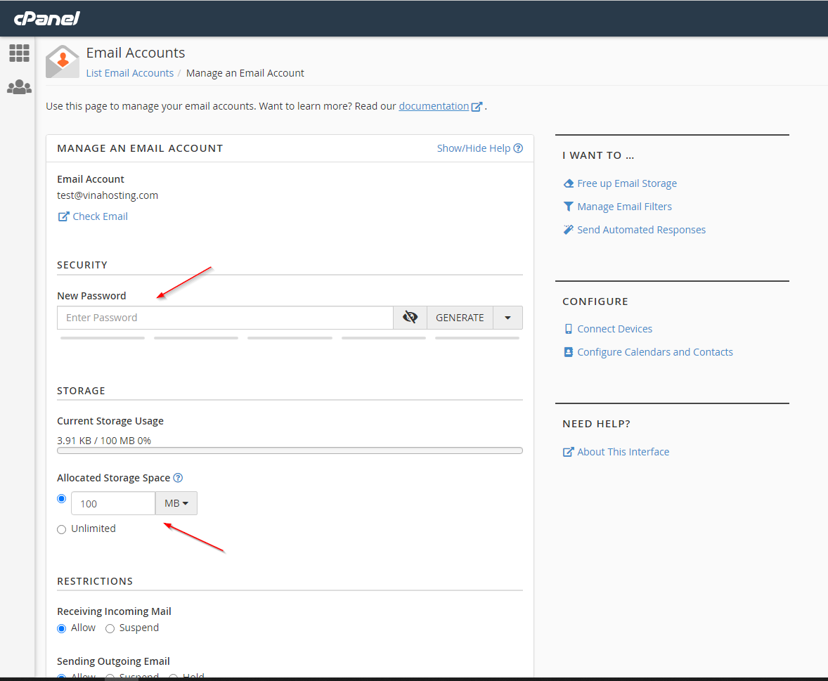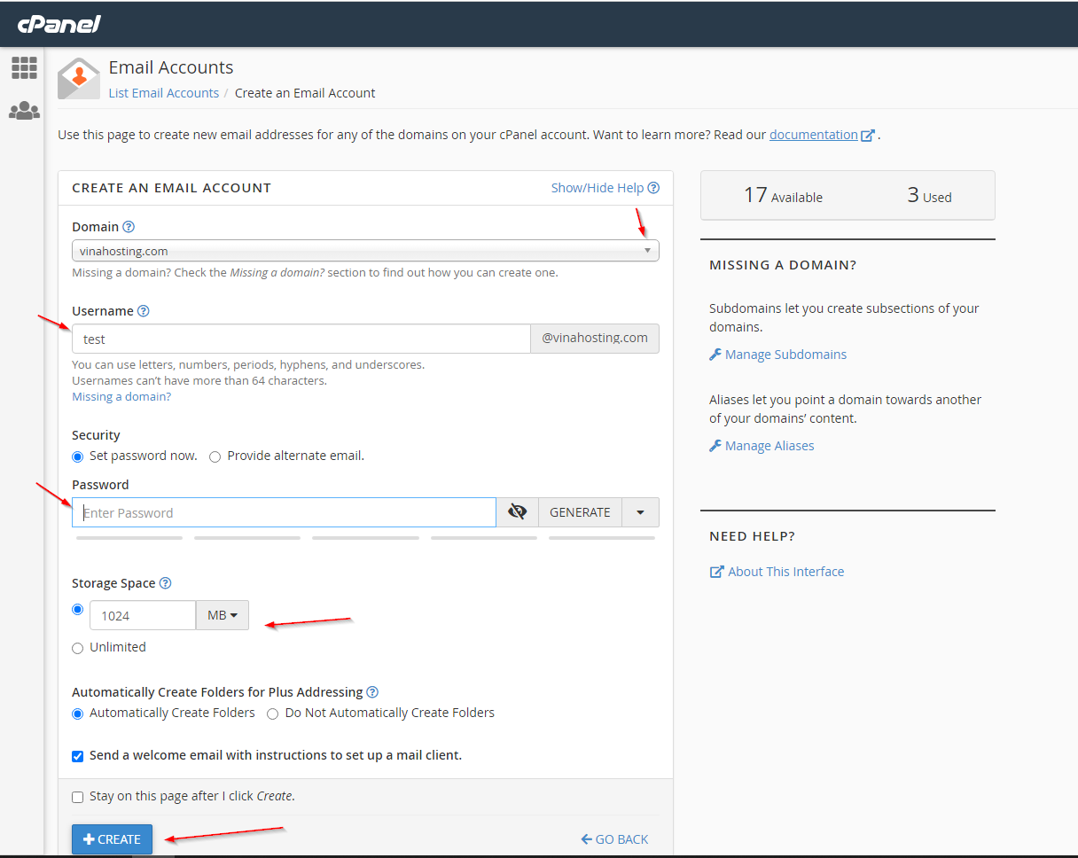 – Username: tên tài khoản email mới. Ví dụ: muốn tạo tài khoản mới là test@vinahosting.com thì ở mục Domain ta chọn “vinahosting.com”, còn mục Username chỉ cần điền “test” là được.